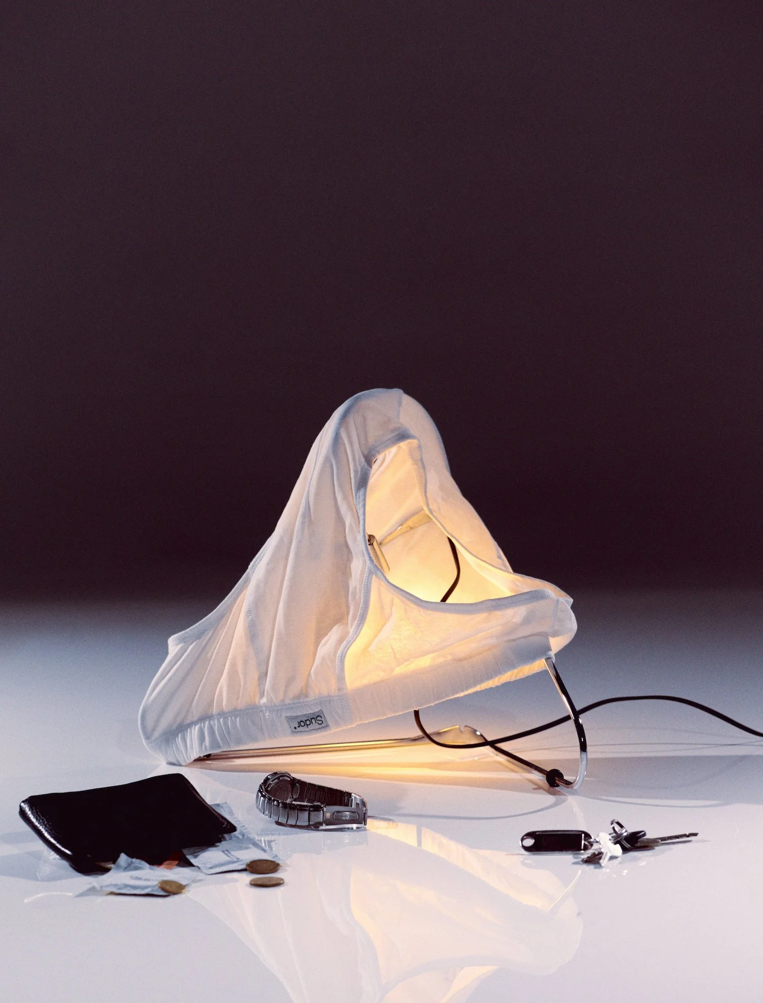 The final decision to use underwear also relates to the idea I mentioned before about the Arab roof tile: transforming a part of the body into an object. Underwear is designed to cover our pelvis; in a way, the lamp also becomes a pelvis. It is a fragment of the body turned into an object that accompanies us and illuminates us.