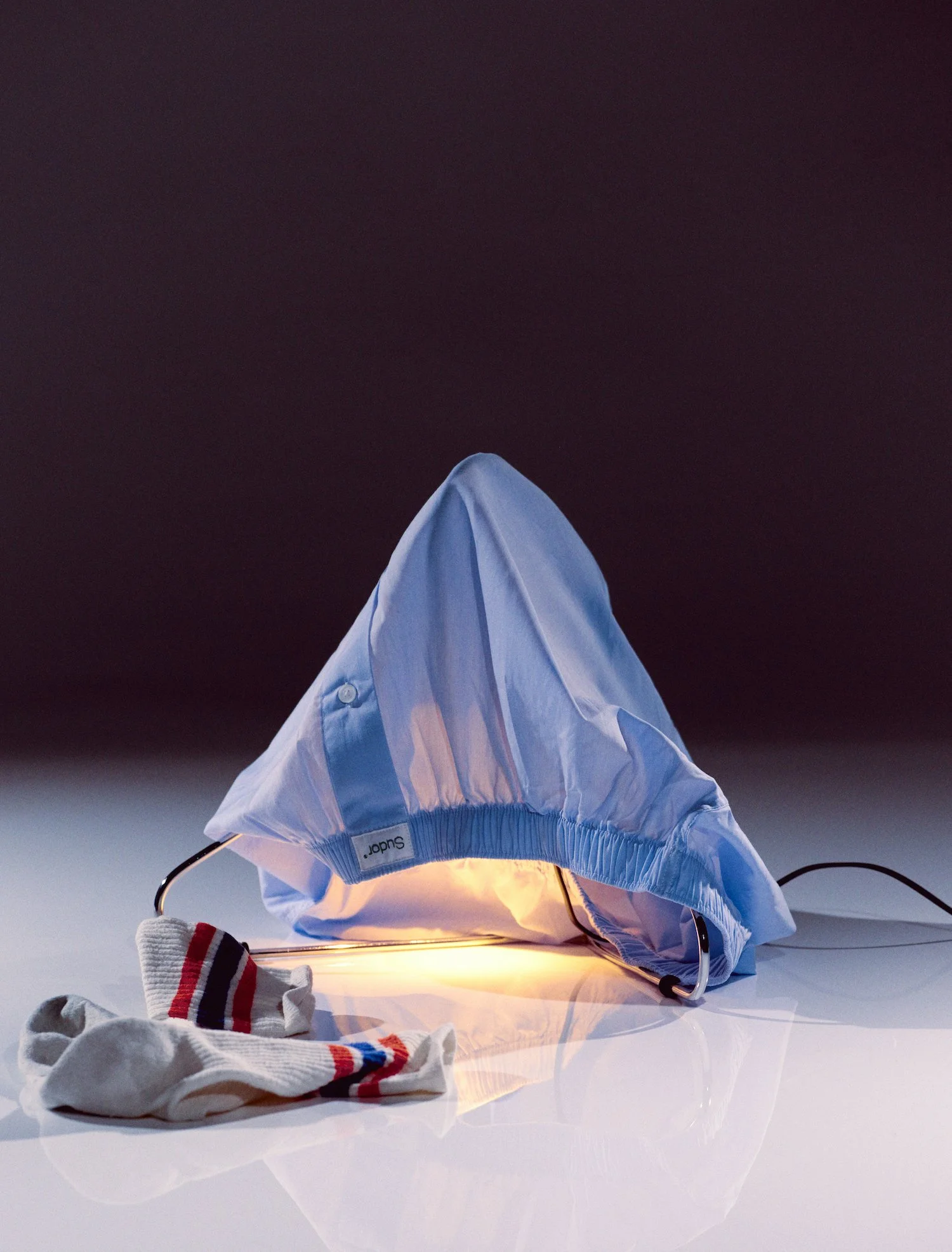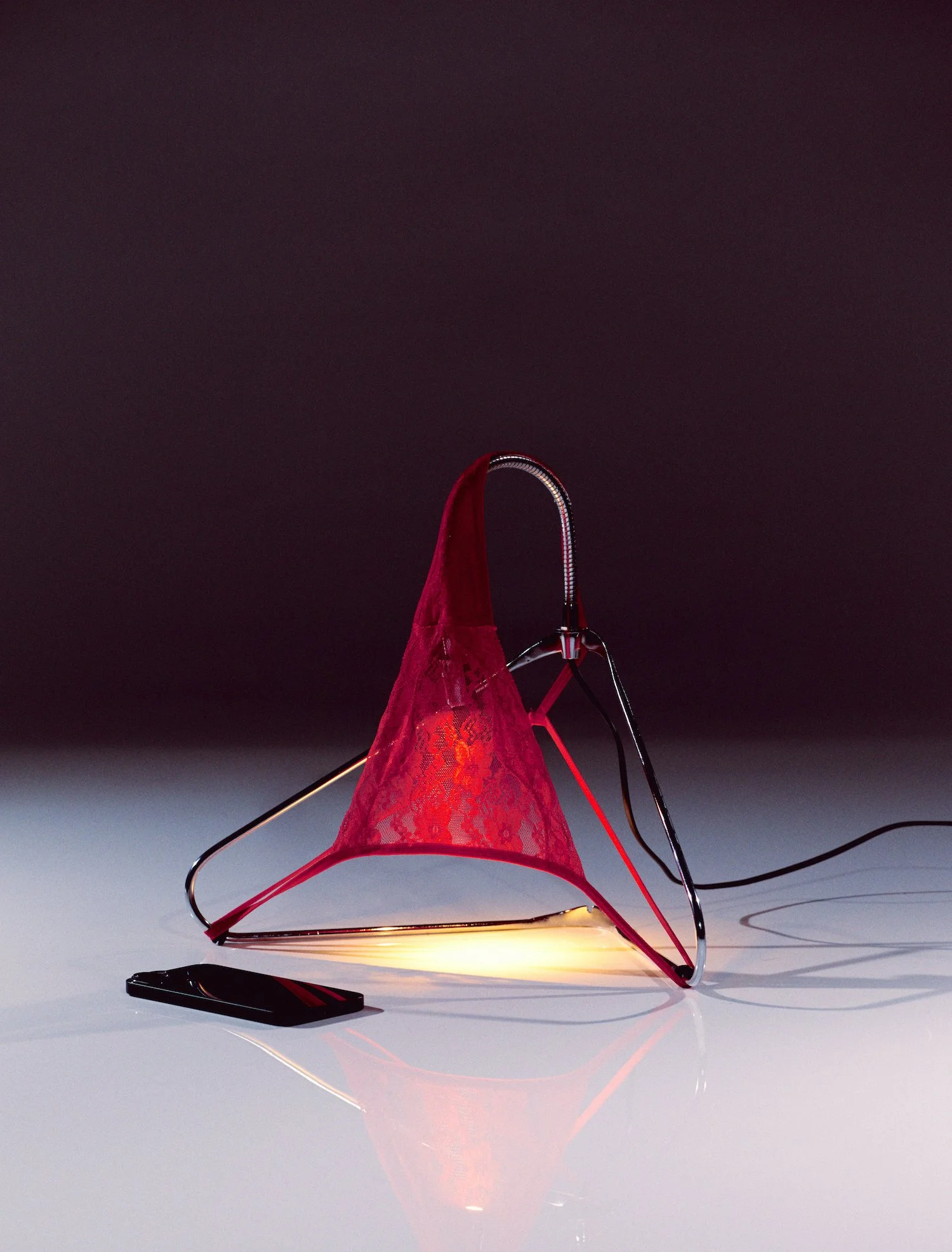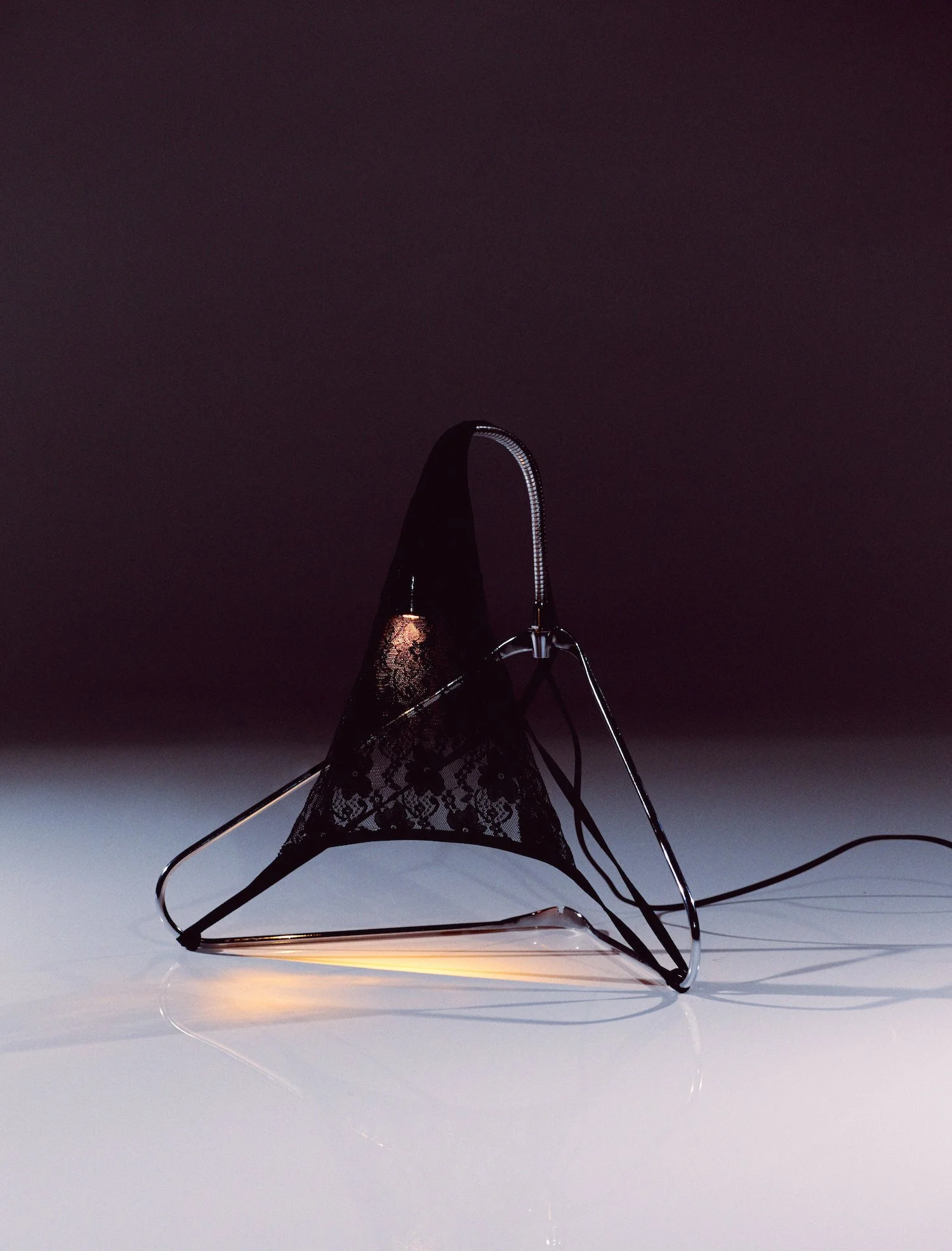 The lamp emerged from the desire to design a lamp together, and it has several origins. I think the most direct one came from a conversation about domestic gestures—about handkerchiefs, and the gesture of softening or filtering light with a piece of fabric when it feels too harsh. We started thinking about how beautiful it would be if that simple gesture could happen with the clothes you return home with, sweaty from the street—after work or after leaving a club late at night. You arrive home exhausted, take off your clothes, and throw them over this structure, which works almost like a hanger. In that way, the light that accompanies you when you come back home carries something of the outside world. The light becomes softer, preparing the atmosphere for domestic retreat—for rest, for sex, for whatever might come next.