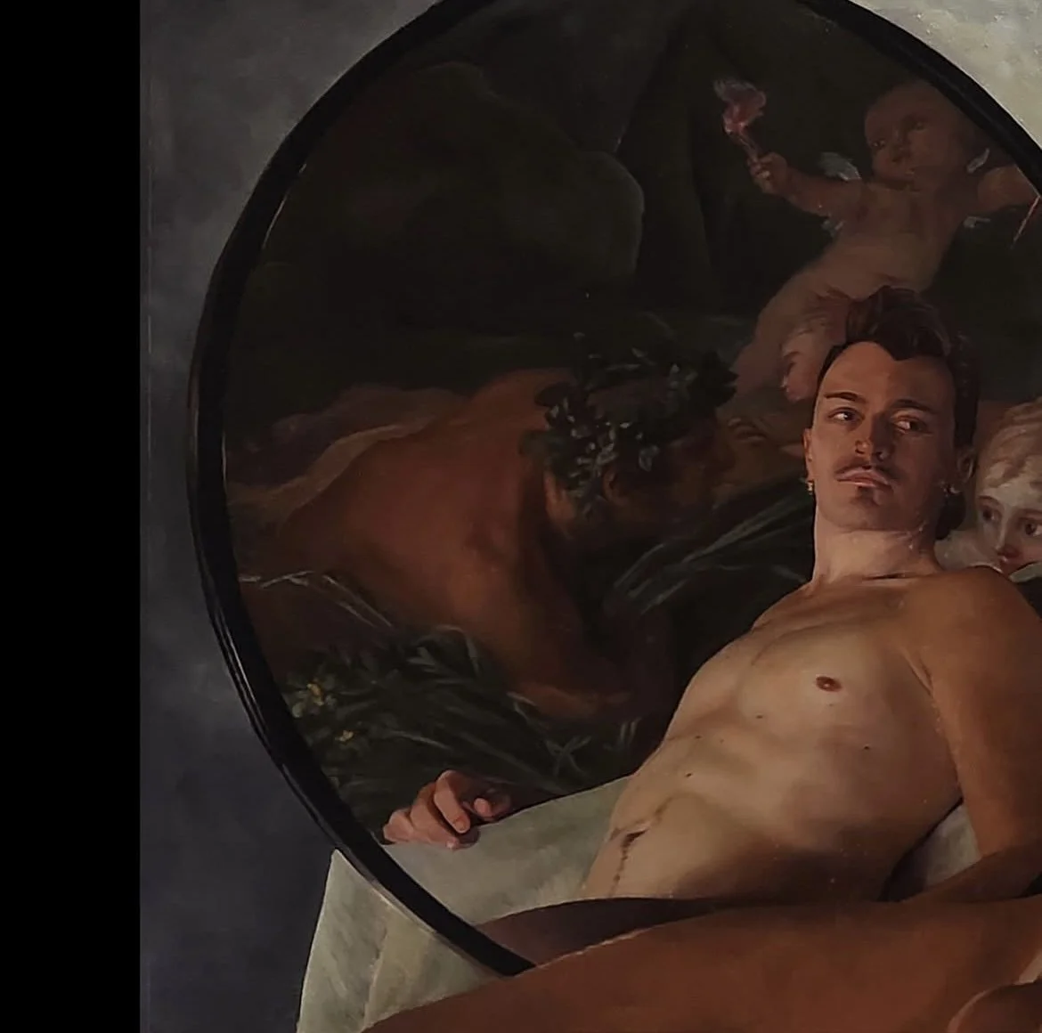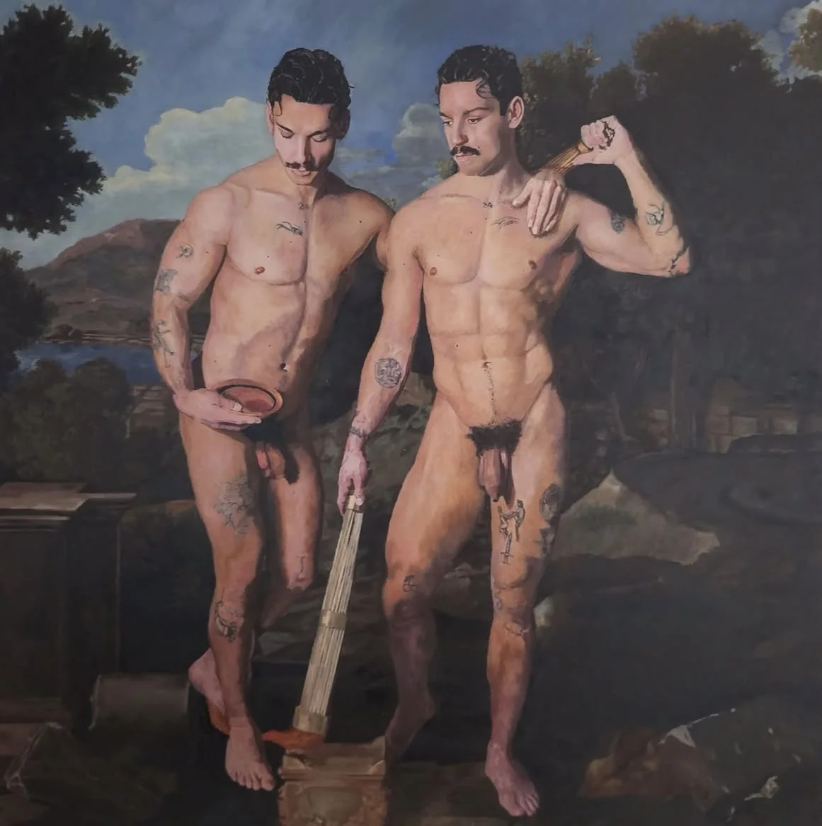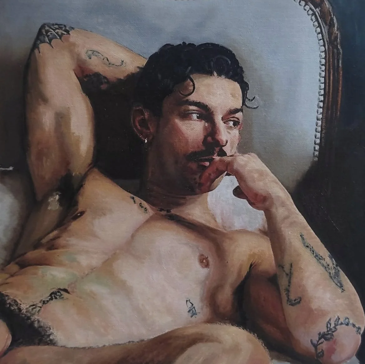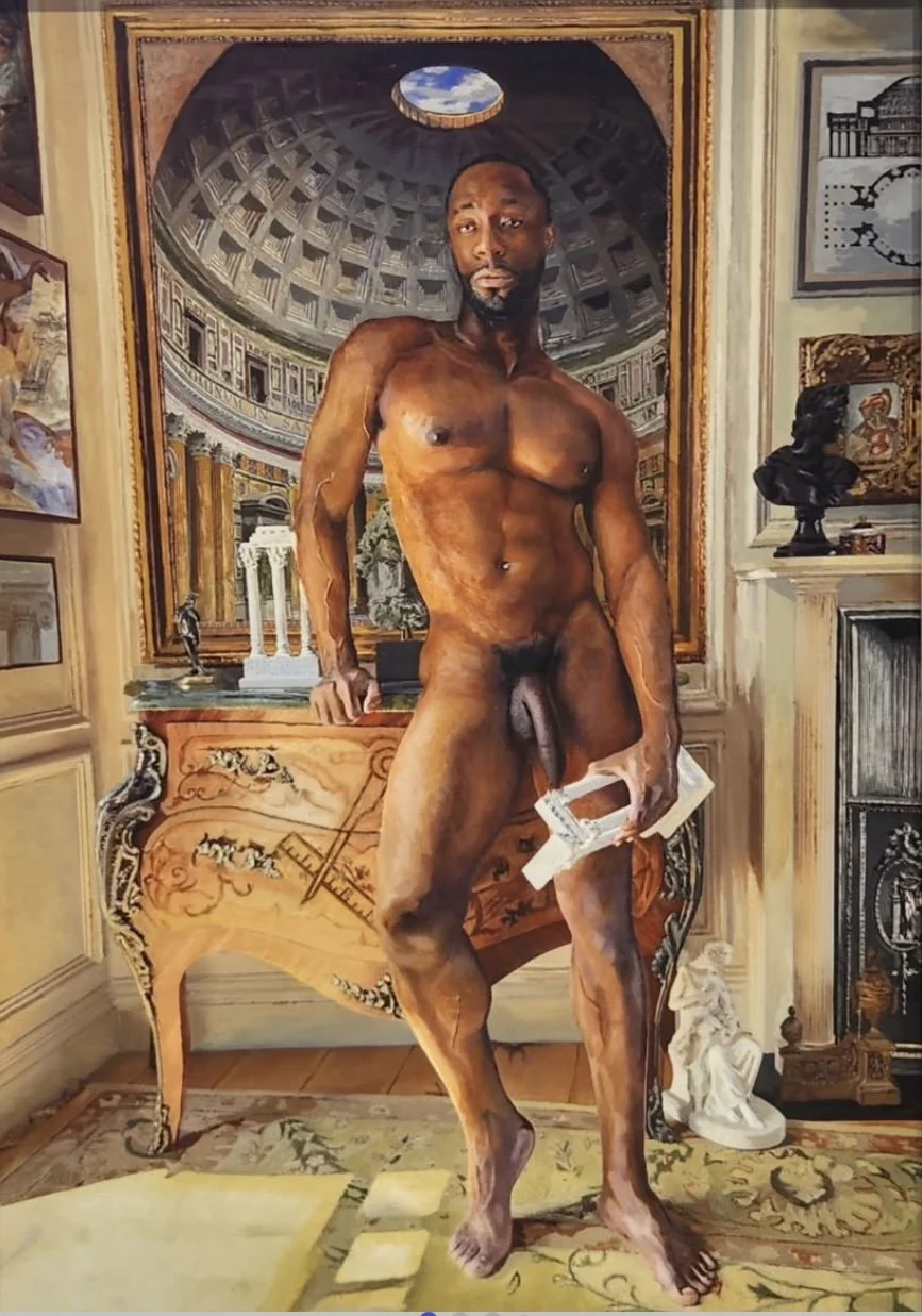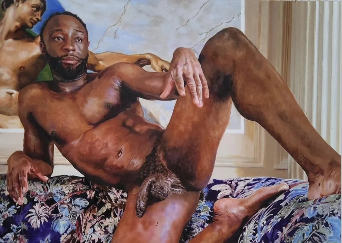 I have been asked why I tend to paint “fit” or “athletic” men – and have been challenged about not being more “representative” of wider body types. But that is to miss the point. My work deliberately picks up quotes from western art history – in particular the classical male form – but then subverts that representation in a number of ways. For example I often set my paintings in my own domestic space – bringing the figure from the classical to the here and now; I may show a nude in a classical landscape but include his very 2026 tattoos – or I may use black or other POC models to represent characters tradionally showen as white. I seek to juxtapose the idealised “male” form – in the past used to convey strength and dominance – or in the case of black and brown bodies to represent the vanquished or subservient – and imbue these familiar forms with new meanings that speak to our actual experiences as men which don’t conform to typical gender stereotypes. I’ll show vulnerability, nurturing, care, tumult, wistfulness – indeed the emotions and responses more associated with the female form in Western Art. I therefore work with my models to show off their physical strength but also their inner life and the fact that even a muscular or strong male form can be gentle, warm and simply beautiful without threat.