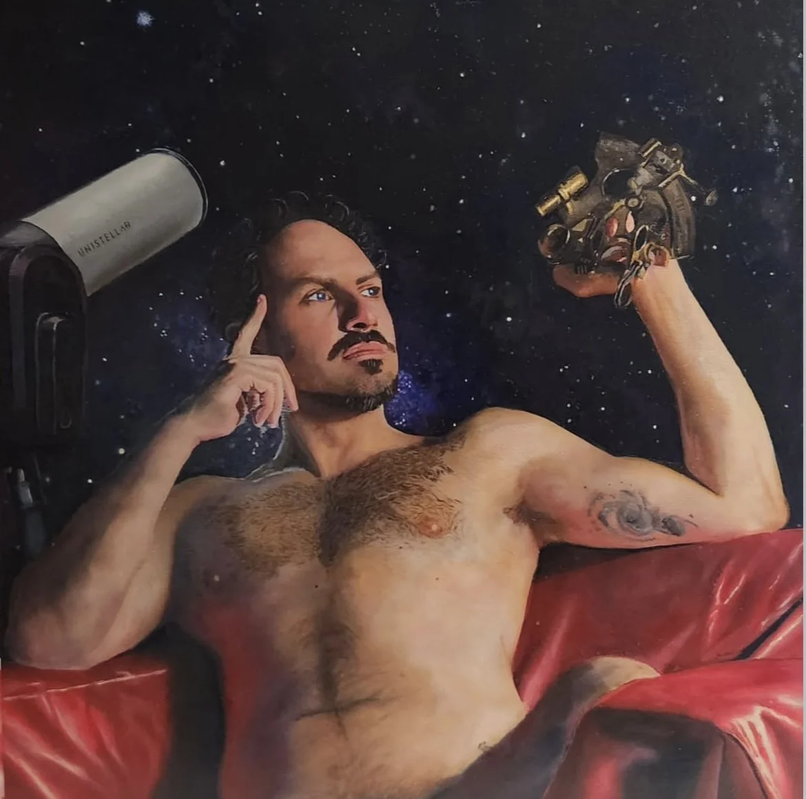 I want to take the “classical” male form, and the tropes of western art history and represent them to tell a more complete version of the male experience. Vulnerability, care, loneliness, sensual or romantic love – as well as the strength necessary to be a man, and while not exclusively, in particular as queer men; the fortitude to endure on going bias and prejudice; the risks of a highly commercialised queer economy and our need for true human connection. My work uses symbolism and allegory to inform the narrative/story being told. For example my painting of Prometheus Chained is visual metaphor (allegory) for the queer experience. Like Prometheus, who’s liver is eaten out every day by the Eagle of the god Zeus’s vengeance, each day we are attacked and assaulted – in the media, in micro-aggression in the workplace or my the judgement of family or wider society; but each night we, and like Prometheus who’s liver grows back, we take time in our communities, our friends and lovers; or sensibilities and our own places – allowing that regrowth that sustains us through the attacks to come. And like Prometheus, who’s very name means Foresight – we know that in the end, no matter how long it takes, we will reach justice.