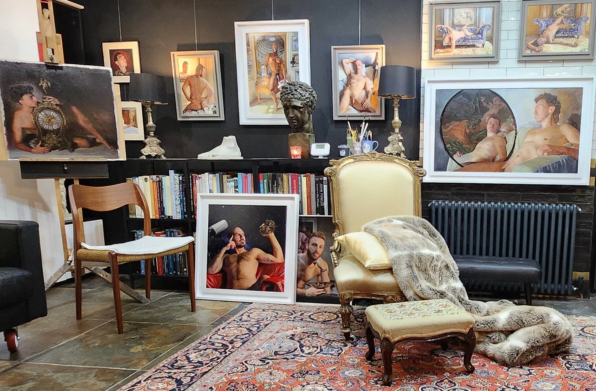 As I mentioned above, I’ve been used to expressing my feelings, interests and indeed desires through the processes of visual representation while also being interesting in a taking part in drama and dance. It has only been recently that I connected these ideas and have been able to identify that my urge to create figurative art, and indeed the nude male form is closely tied up with my love of dance and drama; that in my mind the human form can be used to convey a wide range of emotions and needs. I feel that the human form always creates a narrative. My job, collaborating with my model is to shape that narrative and convey the story and the emotions evoked. A painting is like a moment from a ballet – the meanings being expressed through the sets, props and most of all the human form, shapes and expression.